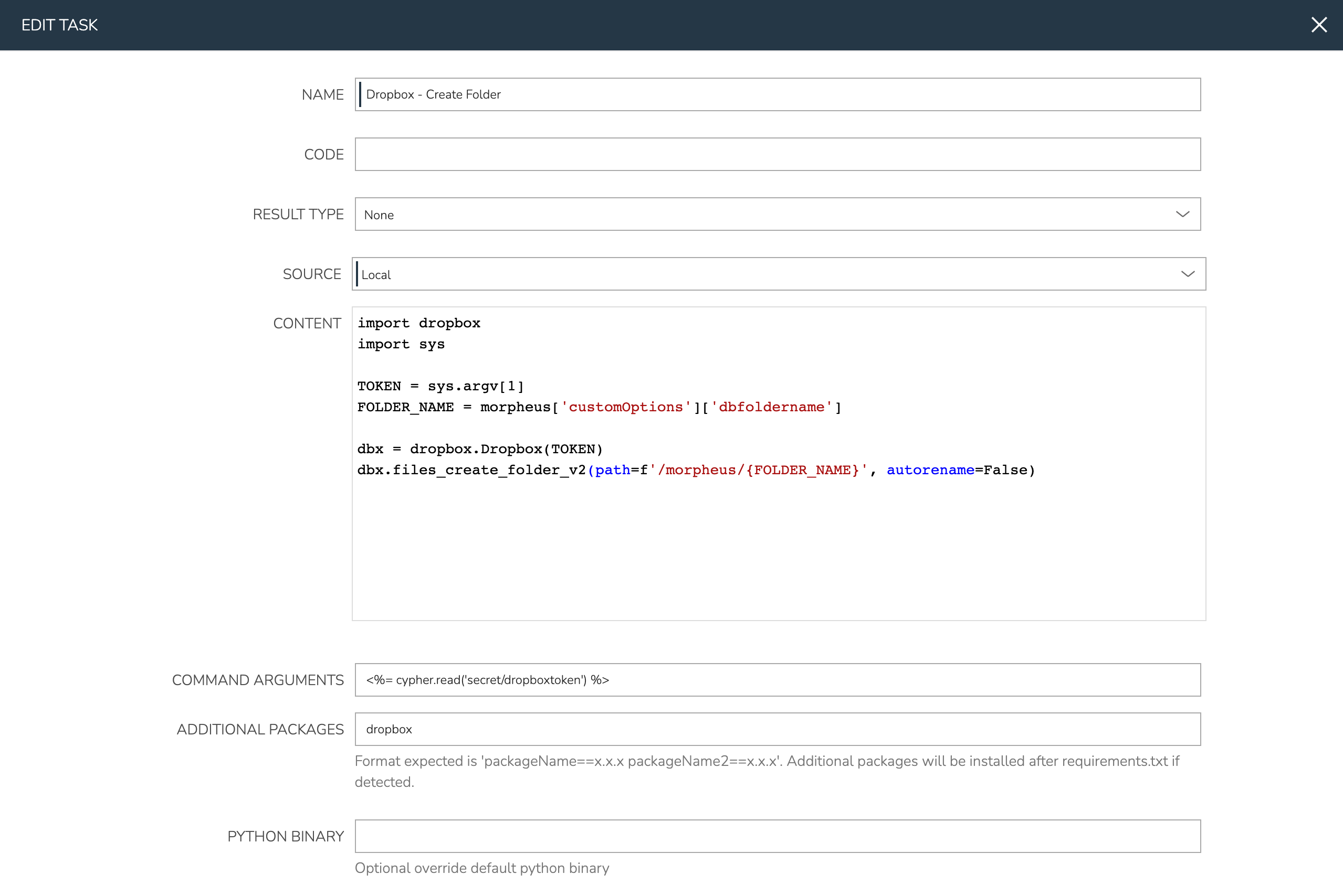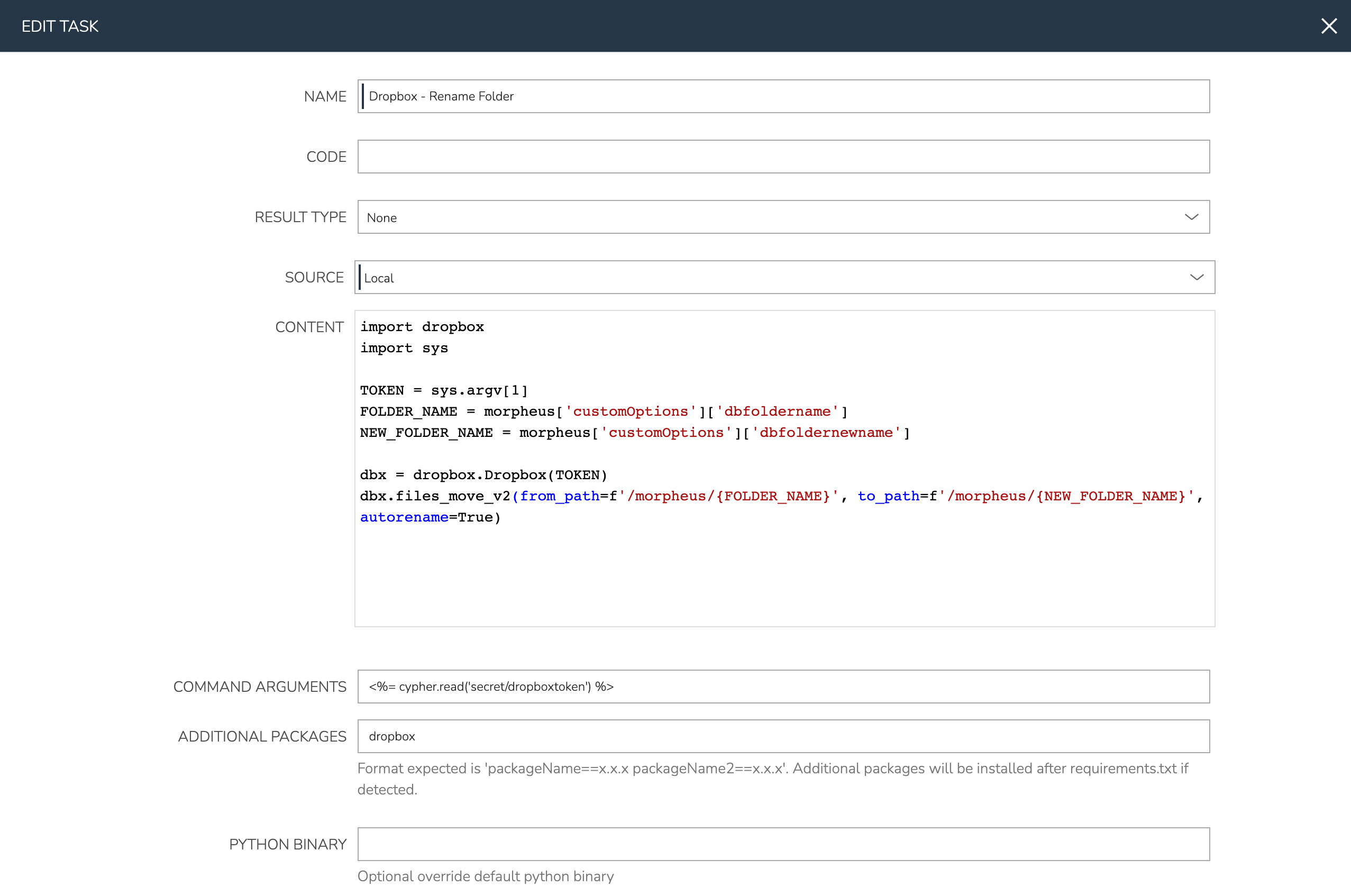 For this example, we need to create four Tasks. One to create the folder, one to rename the folder, one to rename the HPE Morpheus Enterprise Instance, and one to delete the folder. I’ve used Python Tasks to interact with the Dropbox Python SDK. I won’t go into how to write the individual Tasks here but the Python SDK is well-documented if you want to try things out for yourself. The same functions could be carried out using other Task types as well.